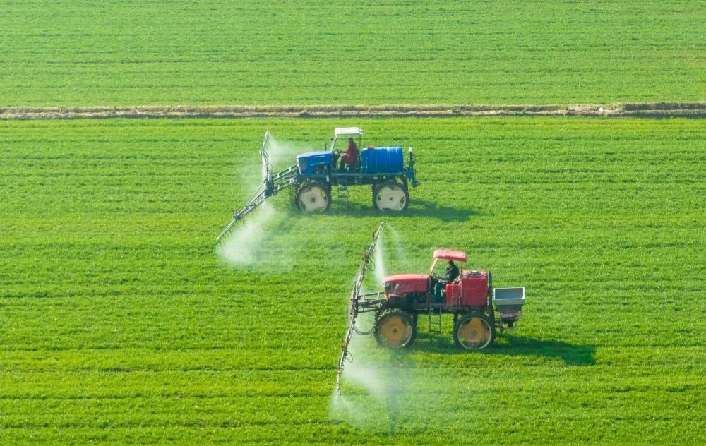 2月28日,在江蘇省海安市大公鎮(zhèn)王院村,村民駕駛植保機(jī)在小麥田間進(jìn)行噴灑藥物作業(yè)(無(wú)人機(jī)圖片)。新華社發(fā)(翟慧勇 攝)