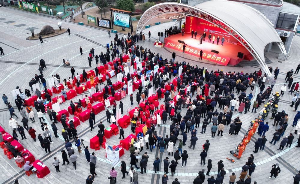 2月4日拍攝的浙江省義烏市蘇溪鎮(zhèn)“百企千崗”新春首場(chǎng)招聘會(huì)現(xiàn)場(chǎng)(無(wú)人機(jī)照片)。新華社記者 徐昱 攝