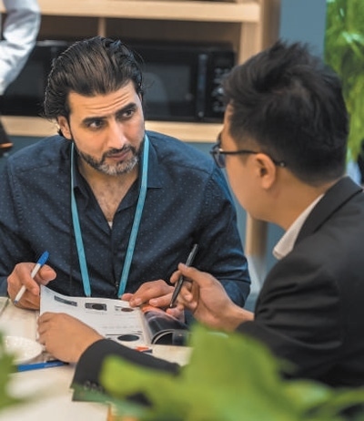 采購商(左)與參展商在洽談業(yè)務(wù)。