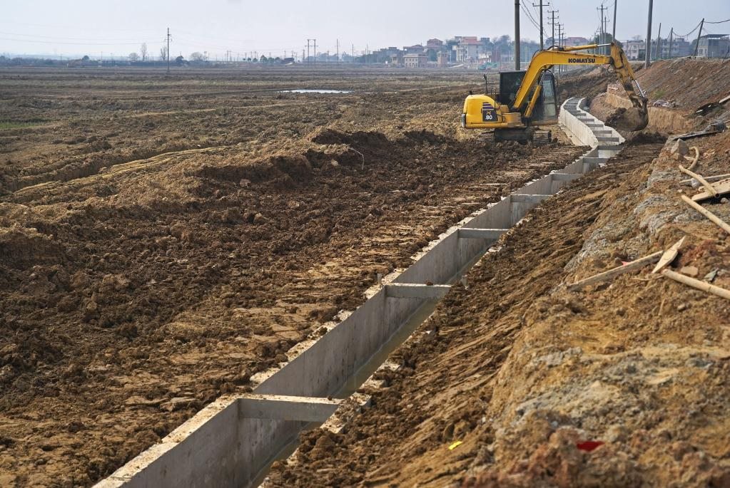 2月21日,施工人員在江西省南昌市新建區(qū)象山鎮(zhèn)高標(biāo)田建設(shè)現(xiàn)場(chǎng)加固灌溉渠。新華社記者 萬(wàn)象 攝