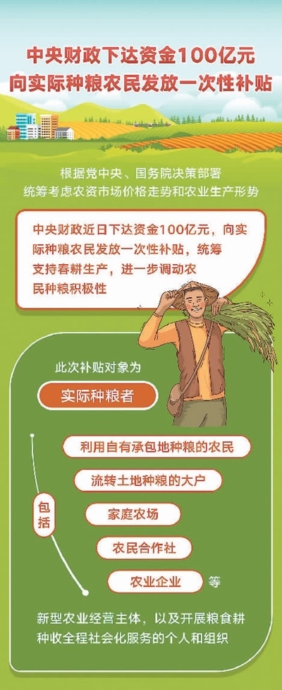 為此,國(guó)家統(tǒng)籌考慮農(nóng)資市場(chǎng)價(jià)格走勢(shì)和農(nóng)業(yè)生產(chǎn)形勢(shì),中央財(cái)政向?qū)嶋H種糧農(nóng)民發(fā)放一次性補(bǔ)貼100億元,以穩(wěn)定農(nóng)民收入、保護(hù)農(nóng)民種糧積極性。