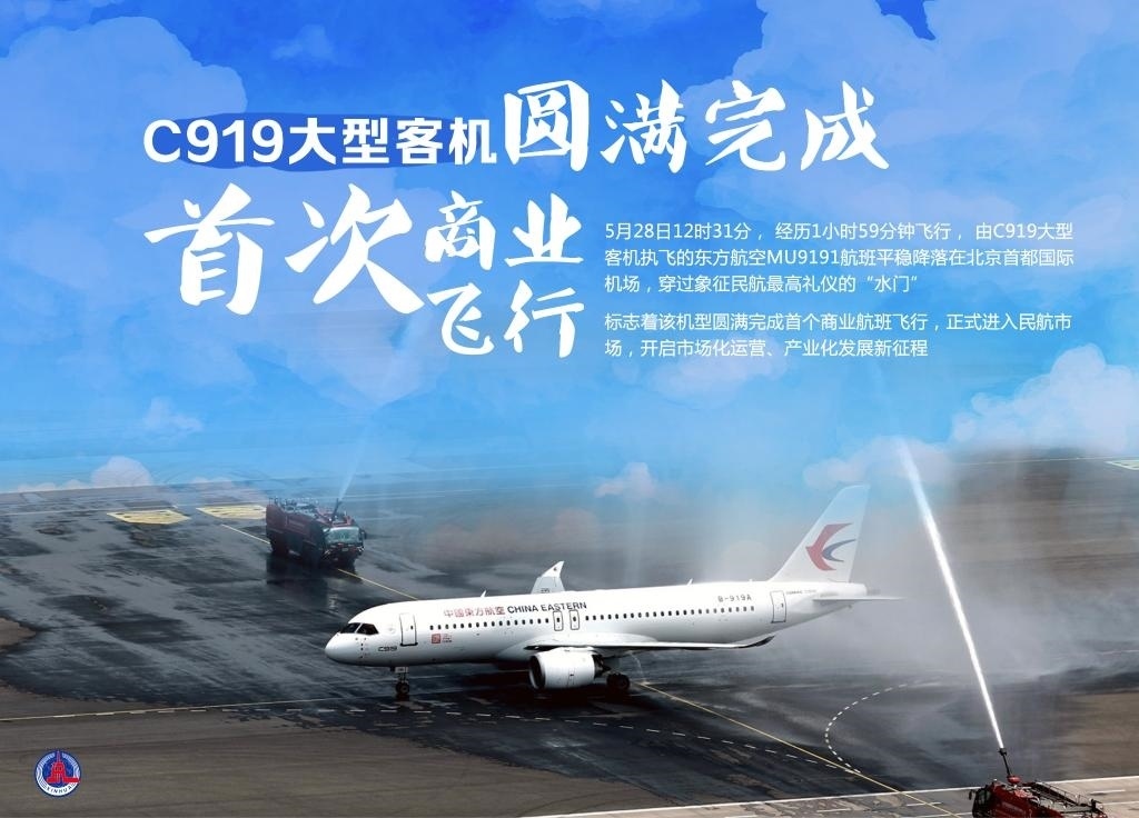 5月28日12時(shí)31分,經(jīng)歷1小時(shí)59分鐘飛行,由C919大型客機(jī)執(zhí)飛的東方航空MU9191航班平穩(wěn)降落在北京首都國際機(jī)場(chǎng),穿過象征民航最高禮儀的“水門”,標(biāo)志著該機(jī)型圓滿完成首個(gè)商業(yè)航班飛行,正式進(jìn)入民航市場(chǎng),開啟市場(chǎng)化運(yùn)營、產(chǎn)業(yè)化發(fā)展新征程。新華社發(fā)