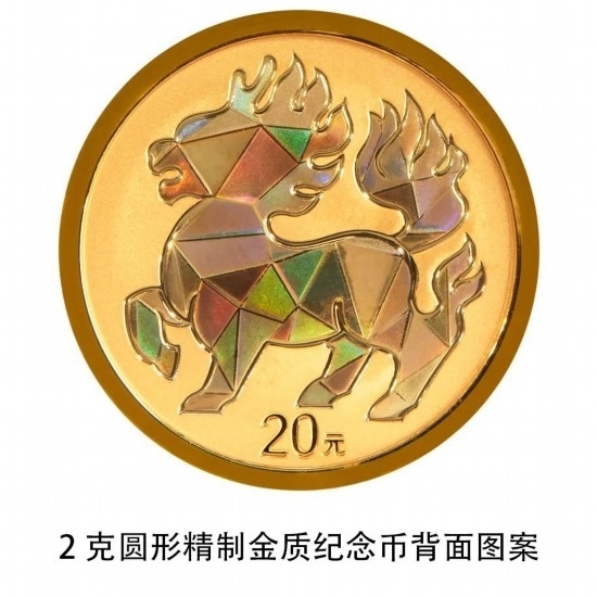 2克圓形金質(zhì)紀(jì)念幣背面圖案為裝飾麒麟造型,并刊面額。