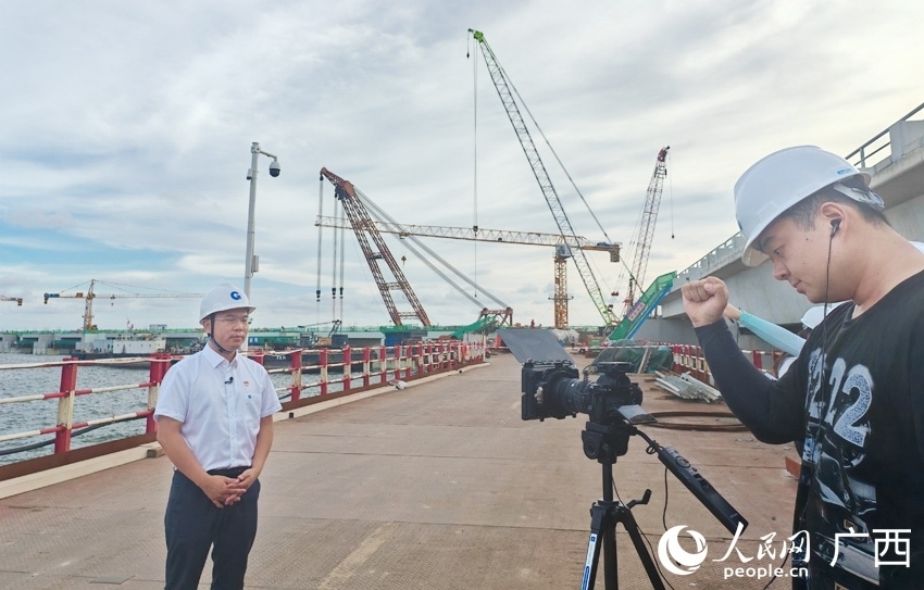 記者在防城港企沙港區(qū)赤沙作業(yè)區(qū)采訪。人民網(wǎng) 朱曉玲攝
