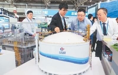 11月29日,在北京舉行的首屆中國國際供應鏈促進博覽會上,參觀者了解中海石油獨創(chuàng)的擁有自主知識產權的全容式液化天然氣(LNG)儲罐。陳曉根攝(人民視覺)