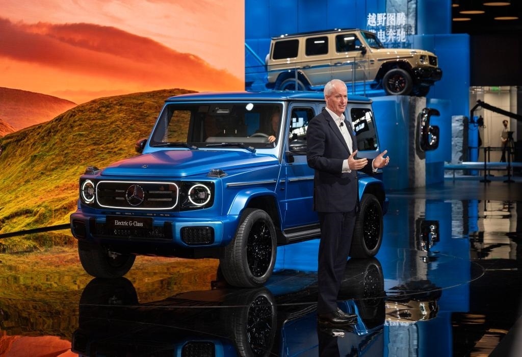 4月25日,在北京中國國際展覽中心順義館舉行的2024北京車展上,梅賽德斯—奔馳集團(tuán)股份公司董事會(huì)成員唐仕凱介紹梅賽德斯—奔馳純電G級(jí)越野車。新華社記者 才揚(yáng) 攝