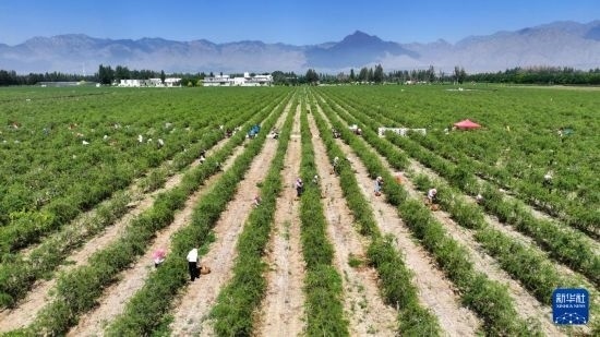 6月12日,采摘工在枸杞地里采摘枸杞。