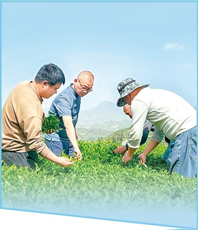 江岔村駐村第一書(shū)記陳毓(左二)在高山茶園查看茶葉品質(zhì)。