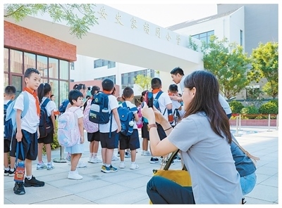 雄安史家胡同小學校門口,家長在送孩子上學。