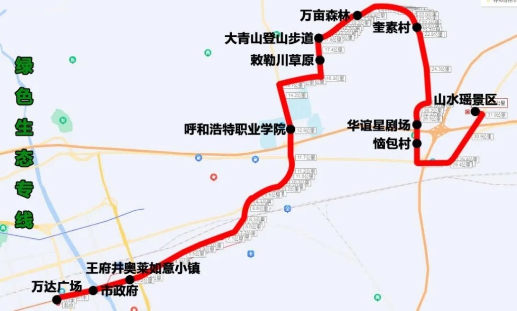 綠色生態(tài)專線(萬達(dá)廣場——山水瑤景區(qū))途經(jīng):新華東街、機(jī)場路、S101、呼和塔拉東街、野馬圖路、Y371、惱包路、110國道、S105省道。沿途設(shè)站:萬達(dá)廣場、市政府、王府井奧萊如意小鎮(zhèn)、呼和浩特職業(yè)學(xué)院、敕勒川草原、大青山登山步道、萬畝森林、奎素村、華誼星劇場、惱包村、山水謠景區(qū),單程:33公里,配車:8—10臺(tái)。