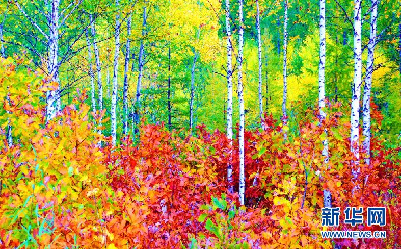 松樹林、白樺林、柞樹林和一片片混交林“染”成不同色彩,茫茫林海宛若一幅匠心獨運的繽紛畫卷。(9月28日攝)新華網(wǎng)發(fā)(欒維敬 攝)
