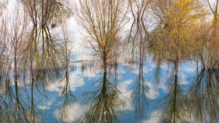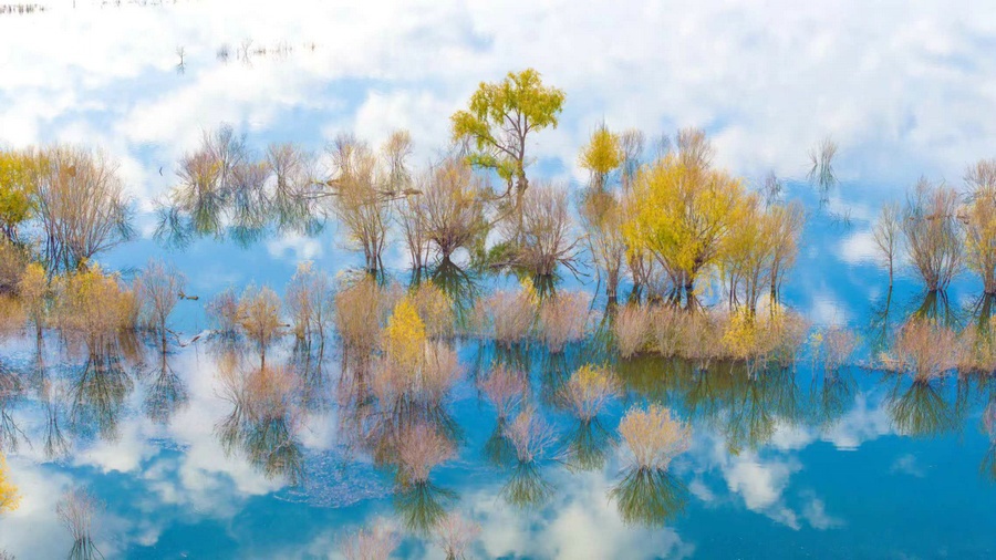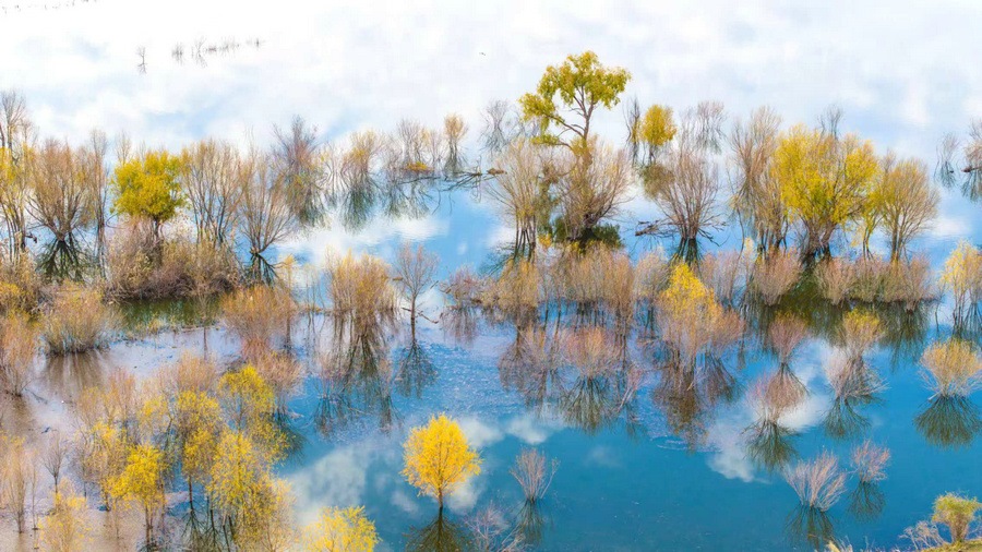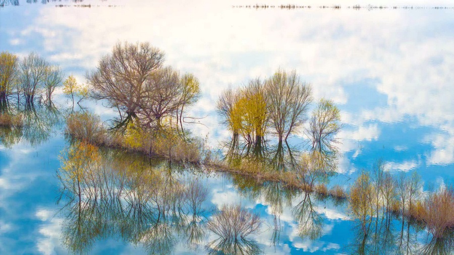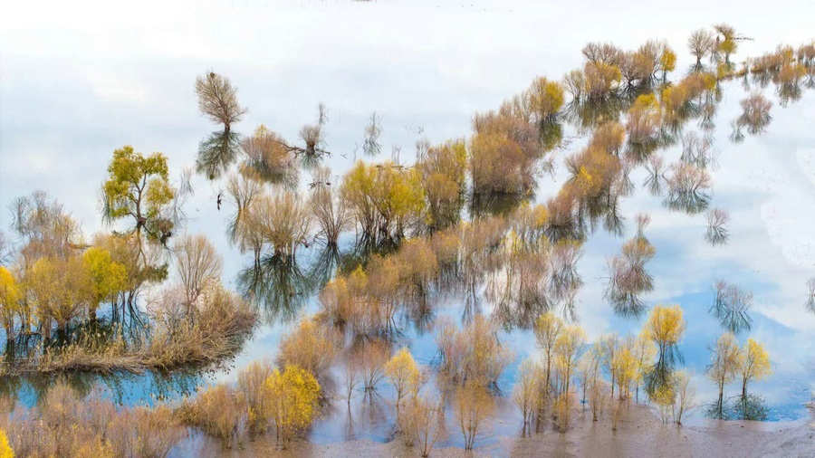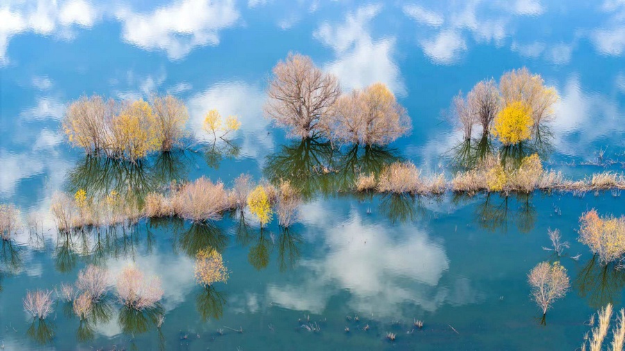 秋冬交替之際,位于呼和浩特土默特左旗的哈素海,水天一色,樹影倒映,構(gòu)成一幅美麗的水彩畫卷,猶如人間仙境。 樂炎 攝影