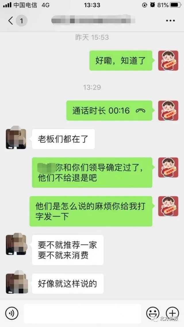 高先生提供給記者的一份微信聊天記錄顯示,當(dāng)高先生提出退還押金的要求時(shí),白泉山莊海世盛宴的工作人員告知,要不就推薦其他人到這里舉辦婚禮,要不就來(lái)這里消費(fèi)以抵消押金。總之,押金是不能退的。
