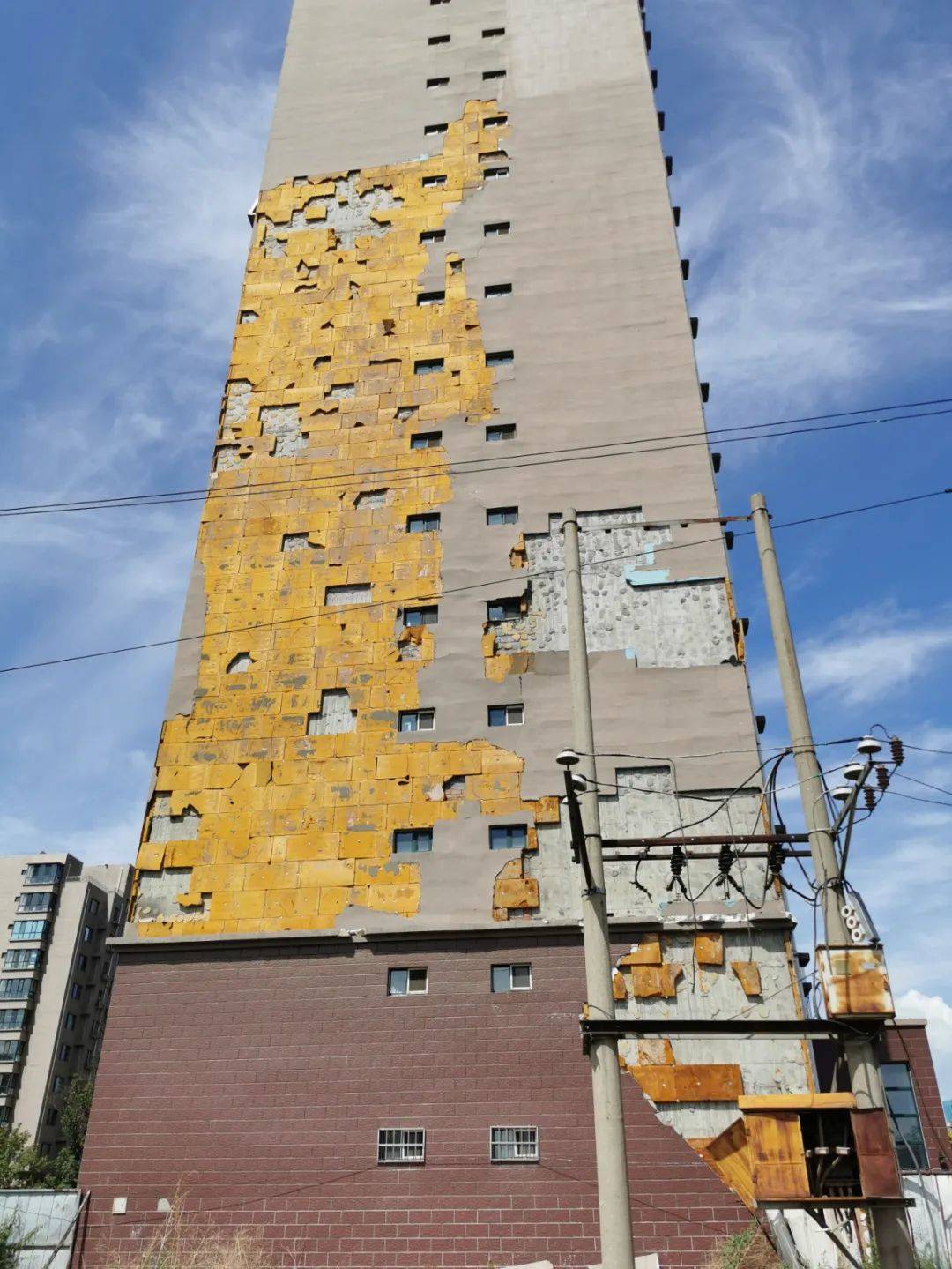 采訪中記者看到,為了提醒路過此處的業(yè)主,小區(qū)的物業(yè)公司在4號樓下懸掛了一條寫有“當(dāng)心高空落物請遠(yuǎn)離墻體繞行”字樣的橫幅,然而即便如此,仍有玩耍的小孩不斷從此處經(jīng)過。相比西側(cè),4號樓東側(cè)的外墻保溫層破損更加嚴(yán)重。遠(yuǎn)遠(yuǎn)望去,13層以下墻壁一多半面積的墻皮已經(jīng)脫落,里面黃色的保溫層有的已經(jīng)掉落,有的則裸露在外。據(jù)郝先生介紹,該小區(qū)里只有4號樓的外墻保溫層存在問題,早在2016年的時候,4號樓的保溫層就出現(xiàn)了脫落的情況。據(jù)他所知,到了2017年,相關(guān)部門曾出面對當(dāng)時破損的保溫層進(jìn)行了修繕。然而此后,保溫層再次出現(xiàn)問題,直到變成了現(xiàn)在的樣子?!皦ζっ撀溆绊懨烙^是其次,最重要的是存在嚴(yán)重的安全隱患?,F(xiàn)在一遇到刮風(fēng)或下雨天氣,大家都不敢從這條道通過,小區(qū)本身占地就較小,院里孩子和老人又比較多,這給大家的日常活動帶來了諸多不便。希望相關(guān)部門能盡快對保溫層進(jìn)行修繕,保障居民的基本人身安全?!焙孪壬f道。(首席記者 張學(xué)博 實習(xí)生 劉彬)
