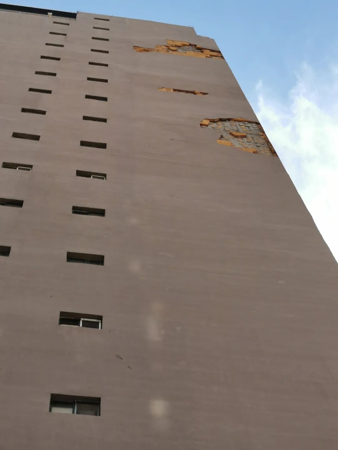 7月1日10時許,記者來到聞都雅苑4號樓下,抬頭望去,該棟樓西側(cè)墻壁有三處地方出現(xiàn)破損,大片的墻皮和里面的保溫層均已脫落。記者注意到,聞都雅苑共有4棟高層,該小區(qū)只有東西和南北兩條主干道以及西側(cè)一條小走廊,而4號樓正好位于南北主干道一側(cè)。據(jù)小區(qū)居民郝先生介紹,不斷掉落的保溫層已經(jīng)威脅到了居民的人身安全。今年5月6日,呼和浩特市出現(xiàn)大風(fēng)天氣,在風(fēng)力的作用下,4號樓東西兩側(cè)的外墻保溫層出現(xiàn)大面積脫落,一位恰巧路過4號樓西側(cè)的女性業(yè)主不幸被掉落的材料砸中,導(dǎo)致腿部受傷,此事也給小區(qū)居民帶來了恐慌。