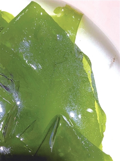 據劉女士回憶,8月9日晚,她和女兒到鄂爾多斯市伊金霍洛旗額爾敦傳統涮(伊旗店)吃飯,母女二人正吃得暢快之際,突然發(fā)現在一盤海帶里有一只蜘蛛(如圖),在盤子里爬來爬去,看見這一幕,母女二人胃口全無。隨即,劉女士和服務人員進行了溝通。