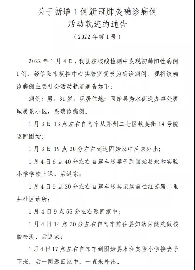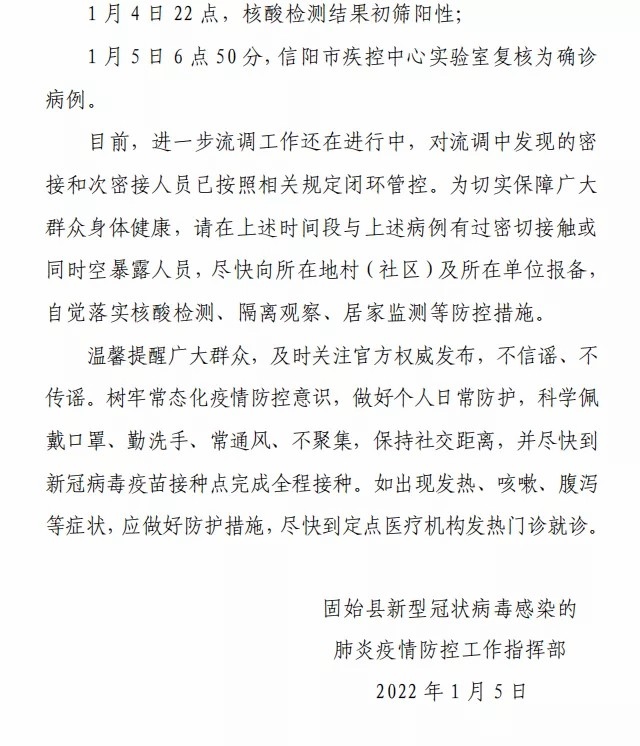 據(jù)固始縣委宣傳部微信公眾號(hào)消息,1月4日,河南固始縣在核酸檢測中發(fā)現(xiàn)初篩陽性病例1例,經(jīng)信陽市疾控中心實(shí)驗(yàn)室復(fù)核為確診病例。