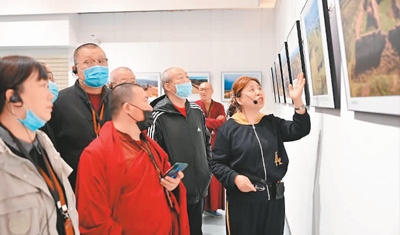 內(nèi)蒙古明長(zhǎng)城科普攝影展在內(nèi)蒙古展覽館開展,高曉梅(右一)向觀眾做介紹。