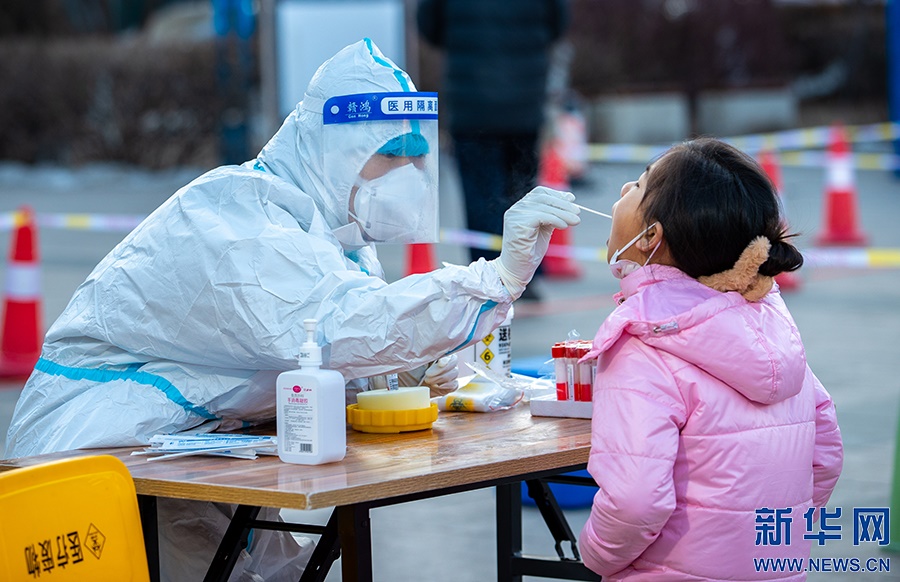 2月21日,在呼和浩特市玉泉區(qū)小召街道五塔寺廣場(chǎng)臨時(shí)核酸采樣點(diǎn),醫(yī)護(hù)人員為市民進(jìn)行核酸采樣。新華網(wǎng)發(fā) (丁根厚 攝)