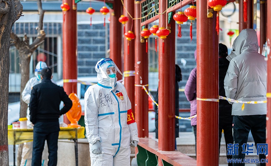 2月21日,在呼和浩特市玉泉區(qū)興隆巷街道芳清園小區(qū)臨時(shí)核酸采樣點(diǎn),點(diǎn)位長(zhǎng)在核酸采樣現(xiàn)場(chǎng)工作。新華網(wǎng)發(fā) (丁根厚 攝)