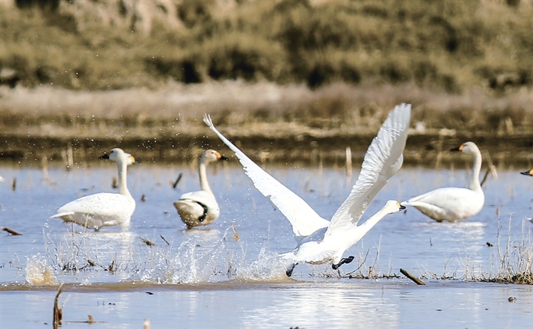 4月1日是國際愛鳥日。當(dāng)天下午,記者在呼和浩特市托克托縣伍什家鎮(zhèn)附近看到,正值春灌時節(jié),沿路兩側(cè)阡陌縱橫的田地里一片“汪洋”,棲息著成群結(jié)隊的天鵝,時而引吭高歌,時而梳理羽毛,時而追逐嬉戲。偌大的田地仿佛天鵝湖一般,呈現(xiàn)出靈動優(yōu)美的自然畫卷。