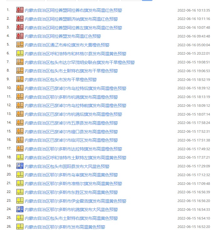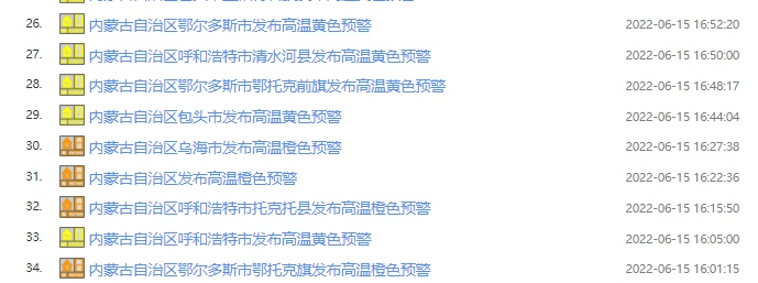 據(jù)內(nèi)蒙古氣象臺預計,6月16~20日連續(xù)5天,內(nèi)蒙古西部及中部偏西大部地區(qū)(阿拉善盟、烏海市、巴彥淖爾市、鄂爾多斯市、包頭市、呼和浩特市等大部地區(qū))將迎來今年首次大范圍35℃以上高溫天氣,其中,西部部分地區(qū)最高氣溫將達37℃及以上,局地超過40℃;20~21日阿拉善盟高溫將逐漸減弱消失,而35℃以上高溫天氣向錫林郭勒盟西部延伸。