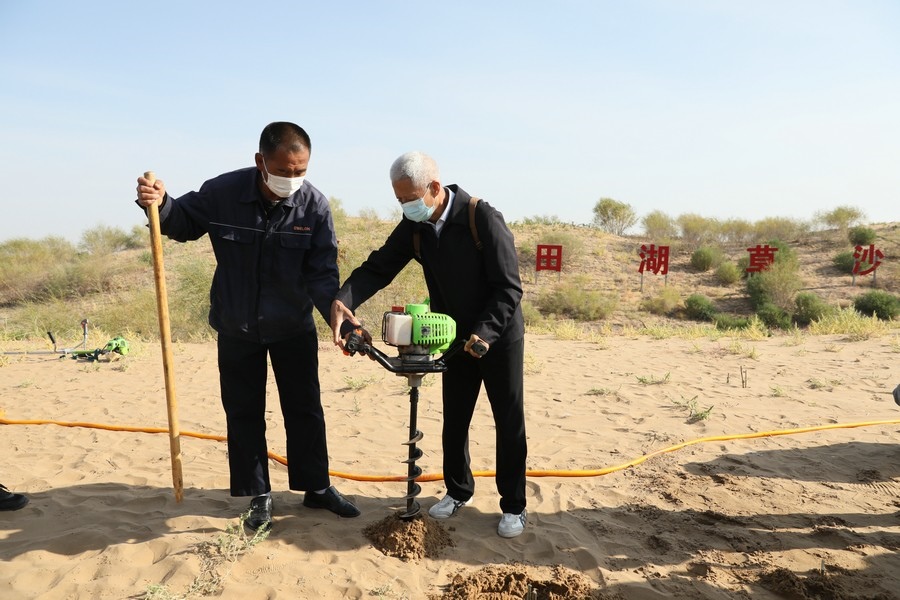 “我們目前栽植沙柳,常用的方法是‘螺旋鉆植樹法’和‘微創(chuàng)氣流植樹法’?!痹趲觳计渖衬纳撤寰G谷,常朝暉的團(tuán)隊向探訪團(tuán)成員演示沙柳的種植方法?!奥菪@植樹法”是用微動力帶動螺旋鉆打孔,插入樹苗,再夯實沙土,而“微創(chuàng)氣流植樹法”,用加壓水槍噴射的水氣流在沙地上沖出直徑幾厘米、深1米的小洞,然后將樹苗快速插進(jìn)去,挖坑、栽樹、回填、澆水,差不多10秒鐘即可種完一株沙柳。這兩種“微創(chuàng)”植樹技術(shù),為“螞蟻森林”的成活率提供技術(shù)保障。