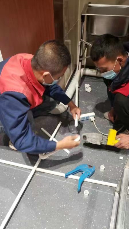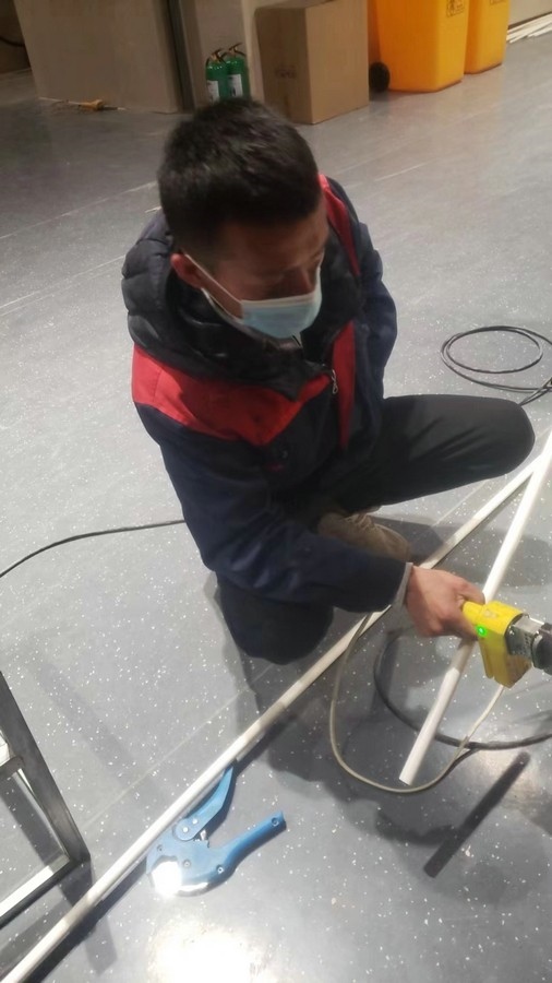 深夜,氣溫突降,冷風(fēng)毫不留情地灌入現(xiàn)場施工人員的衣服里,但無一人松勁、無一人退縮。由于材料分布范圍較大,只見身穿紅、藍工作服的他們徒步穿梭于各樓層之間,一刻不停地搬運管件及材料、安裝設(shè)備。因疫情管控不能到現(xiàn)場的同事則堅持利用通訊工具提供遠程技術(shù)支持,為前線答疑解惑。方艙醫(yī)院建設(shè)屬于應(yīng)急工程,時間緊、任務(wù)重,加之現(xiàn)場材料缺乏,施工人員只能就地取材,爭分奪秒的同時,“突擊隊”表現(xiàn)出了高度的專業(yè)性,迅速、細致、高效地進行管道鋪設(shè)和熱水器安裝……凌晨4點,在現(xiàn)場全體施工人員的共同努力下,方艙醫(yī)院水暖安裝工作順利完成。