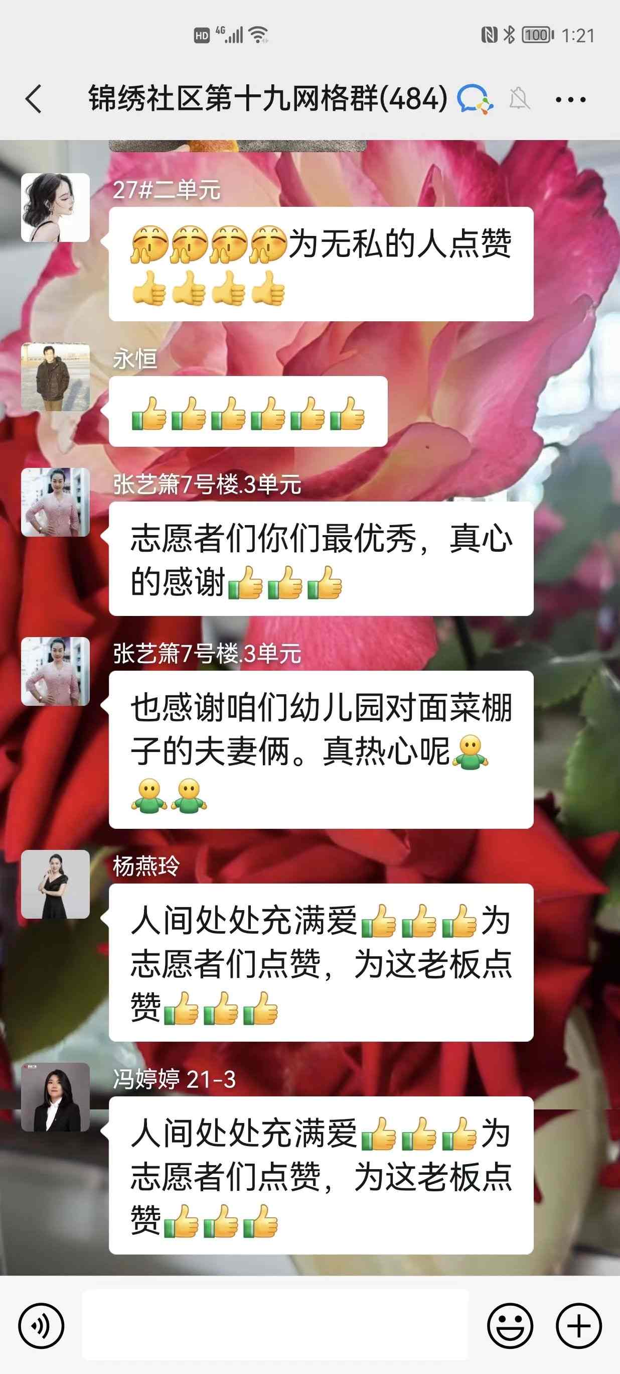 “10元、20元、30元、50元、100元……”10月28日晚,在錦繡社區(qū)第十九網(wǎng)格群,業(yè)主的捐款紛至沓來,短短4個小時籌款近萬元。原來,由于景觀花園小區(qū)物業(yè)原有的消殺工作人員肌肉拉傷,消殺速度遠遠達不到預期,業(yè)主楊博鵬便在群里發(fā)出組建一支消殺志愿者團隊的倡議,號召業(yè)主們捐款購買專業(yè)消殺彌霧機和藥品。沒想到倡議得到了廣大業(yè)主的一致響應,“我報名!”“我也報名,躺著也是躺著,不如干點有意義的事!”網(wǎng)格群里沸騰起來,大家紛紛解囊相助,張富、斯琴吐、薛國清、崔占、史永生等15位業(yè)主還踴躍報名參加消殺志愿者團隊。