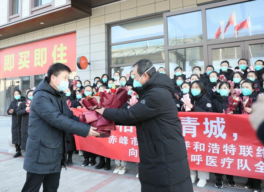 新華融媒、北疆新聞網(wǎng)消息(記者 張楊)“自呼和浩特疫情發(fā)生以來,50多個晝夜,白衣天使們逆行參戰(zhàn),奮戰(zhàn)在抗疫第一線,為呼和浩特保衛(wèi)戰(zhàn)貢獻了自己的力量,體現(xiàn)了白衣天使的責任和擔當,更展現(xiàn)了赤峰人奮勇拼搏的精神,圓滿完成了援呼醫(yī)療各項任務,沒有辜負家鄉(xiāng)人民的重托,大家辛苦啦!”12月5日,在赤峰援呼普通病區(qū)醫(yī)療隊圓滿完成各項任務,即將凱旋之際,赤峰市人民政府駐呼和浩特聯(lián)絡處和內(nèi)蒙古赤峰商會,共同到醫(yī)療隊駐地看望醫(yī)療隊員。赤峰市人民政府駐呼和浩特聯(lián)絡處副主任李子輝,代表駐呼聯(lián)絡處和內(nèi)蒙古赤峰商會在呼和浩特地區(qū)鄉(xiāng)友,向援呼醫(yī)療隊領隊羅俊祥等醫(yī)護人員獻上鮮花和對家鄉(xiāng)同胞的親切問候。