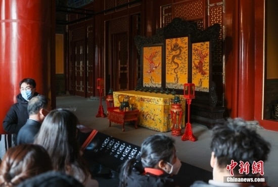 北京景山公園,市民參觀壽皇殿內的插屏。中新社記者 易海菲 攝