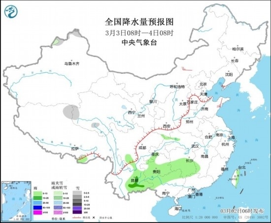 全國降水量預(yù)報圖(3月2日08時-3日08時) 圖片來源:中央氣象臺網(wǎng)站