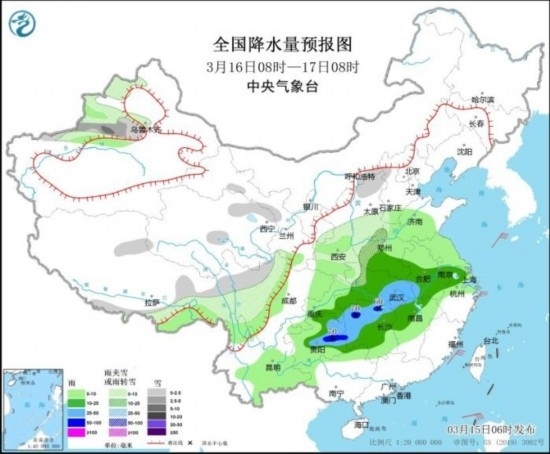 3月16日08時(shí)至17日08時(shí),新疆沿天山地區(qū)、西藏東部、山西北部、川西高原北部等地部分地區(qū)有小到中雪。黃淮西部、江淮西部和南部、江漢大部、江南北部和西部、西南地區(qū)東南部等地部分地區(qū)有中到大雨,其中,湖南北部和西部、貴州中東部等地部分地區(qū)有暴雨(50~70毫米),并伴有短時(shí)雷暴大風(fēng)、冰雹等強(qiáng)對流天氣。