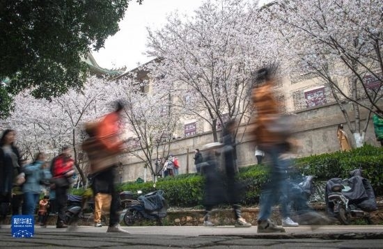 3月18日,來自各地的抗疫醫(yī)護人員及家屬在武漢大學校園共賞櫻。