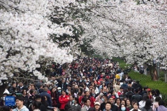 當日,武漢大學舉行抗疫醫(yī)護賞櫻專場。珞珈山下,來自全國各地的1.6萬余名抗疫醫(yī)護人員及家屬赴約賞櫻。