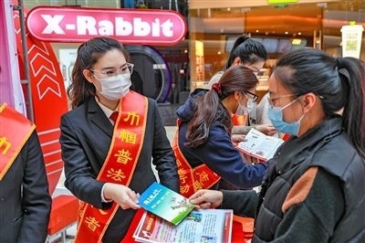 天津法院“巾幗普法志愿者”為群眾解讀婦女權益保障法內容。