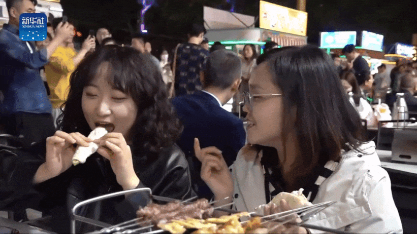 4月14日晚,新華社記者正在進(jìn)行“沉浸式打卡淄博燒烤”直播。圖為直播畫面動(dòng)圖。