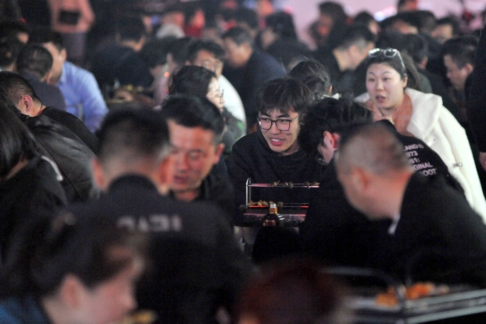 4月14日晚,淄博燒烤攤,眾人正在吃燒烤。(新華社發(fā) 劉一鳴攝)