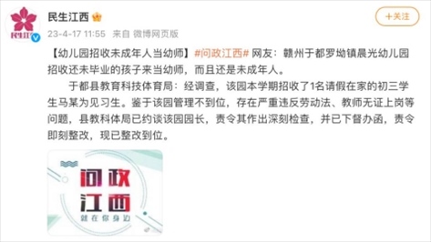 ·贛州于都縣一幼兒園招收初三學(xué)生為見習(xí)生,園長被約談。
