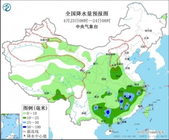 全國降水量預(yù)報圖(4月23日08時-24日08時)