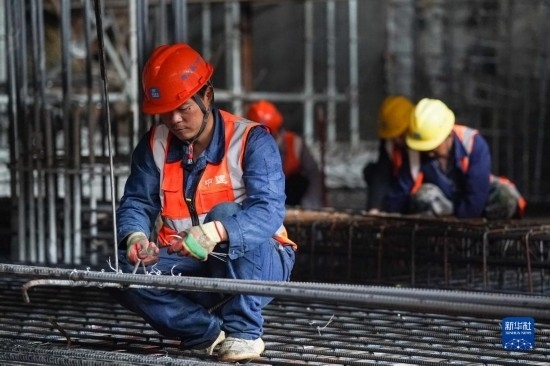 5月3日,在長(zhǎng)沙西站建設(shè)工地,工人做混凝土澆筑前準(zhǔn)備。