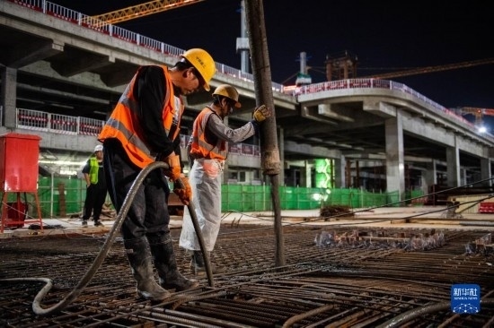 5月3日,在長(zhǎng)沙西站建設(shè)工地,工人進(jìn)行混凝土澆筑作業(yè)。