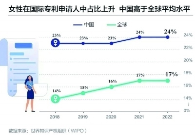 世界知識(shí)產(chǎn)權(quán)組織數(shù)據(jù)顯示,2021年,中國(guó)是全球國(guó)際專利(PCT)女性申請(qǐng)人的最大來源地。2022年,中國(guó)女性發(fā)明者所占比例為24%,高于全球平均水平。