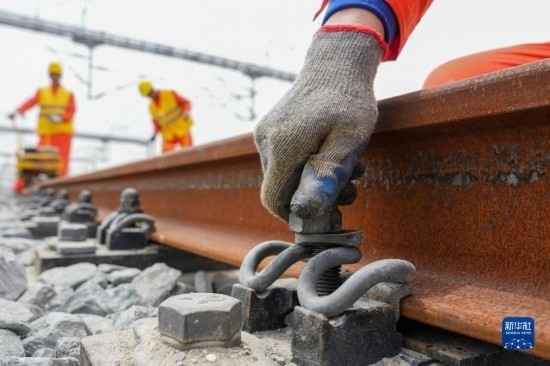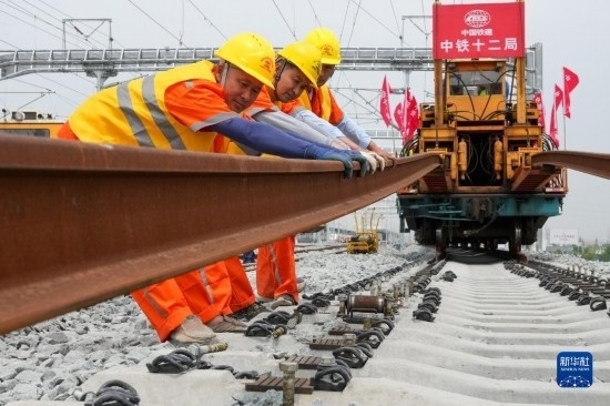 5月20日,在滬寧沿江高鐵太倉站施工現(xiàn)場,中鐵十二局的工程人員準(zhǔn)備進(jìn)行螺栓緊固作業(yè),將對接好的鋼軌固定。