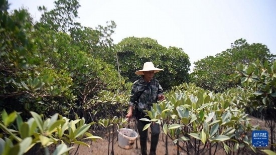 莫積瑞老人護(hù)理紅樹(shù)林小苗(5月20日攝)。