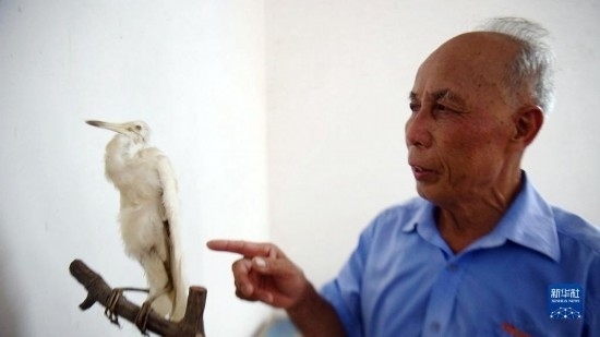 莫積瑞老人介紹白鷺標(biāo)本的制作過(guò)程(5月20日攝)。