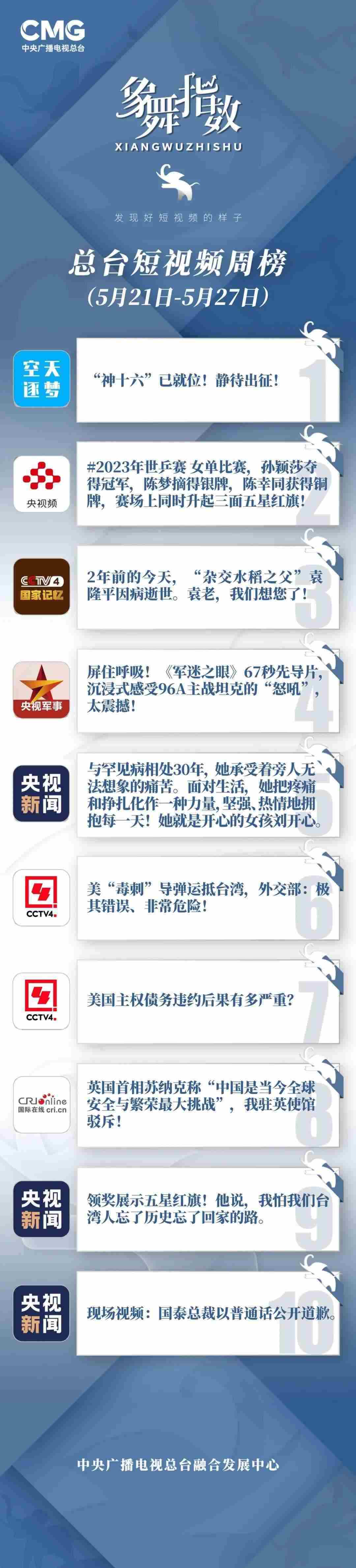 中央廣播電視總臺“象舞指數(shù)”評議品牌,推出主流媒體短視頻周榜、總臺短視頻周榜。在2023年5月21日—5月27日,這些內容引發(fā)大眾關注:
