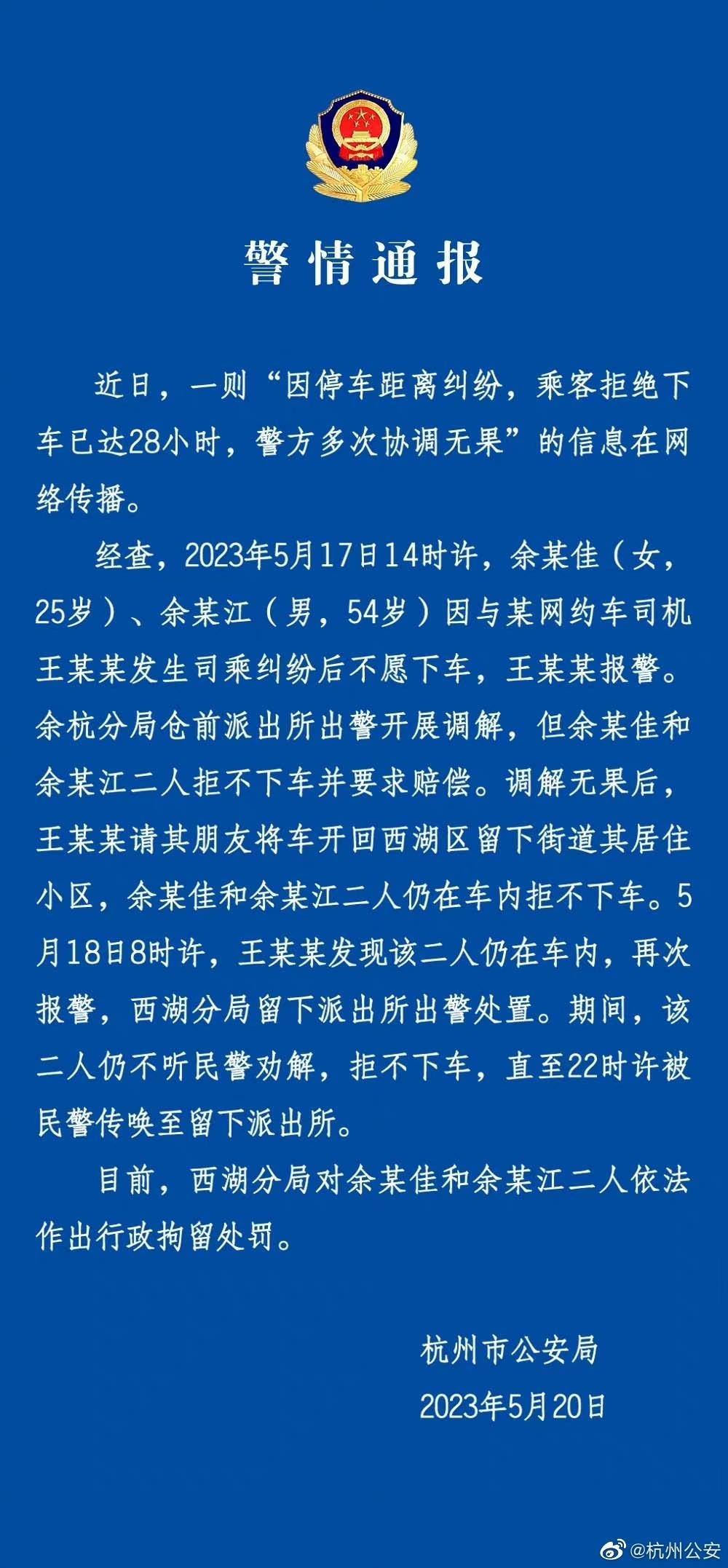 近日,杭州一名網(wǎng)約車司機(jī)稱,因兩名乘客打車點(diǎn)不能停車,商議在距離上車地點(diǎn)20米處等乘客。乘客上車后對(duì)司機(jī)大吼大叫,司機(jī)決定取消訂單。但上述乘客卻“賴”在網(wǎng)約車上拒絕下車,時(shí)間超過24小時(shí)。沖突期間警方曾前來調(diào)解,但勸說未果。5月20日,杭州公安通報(bào),兩名乘客被行政拘留7日。