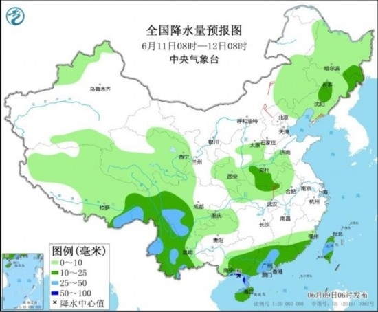 圖4 全國降水量預報圖(6月11日08時-12日08時)