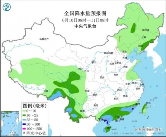 圖2 全國降水量預報圖(6月9日08時-10日08時)